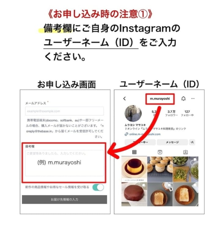 備考欄に必ずInstagramのユーザーネーム(ID)を記載してください。